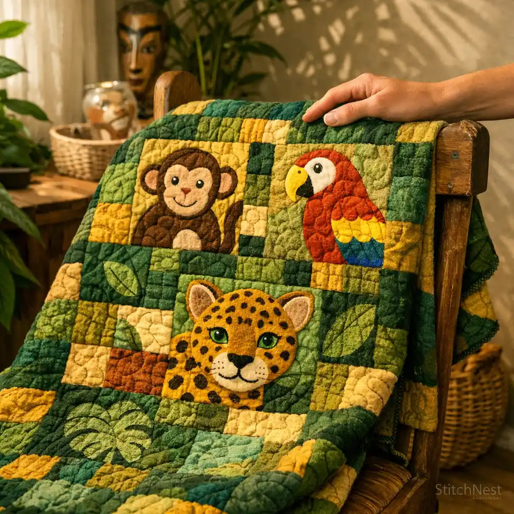 This one feels fuller and more layered, especially when you combine different shades of green with darker accents. The animal shapes can be slightly more detailed here, allowing you to play with contrast and depth. It is a great option when you want your quilt to act as more than just a blanket and feel like a central piece in the room. Even small touches like leaf motifs can tie everything together.