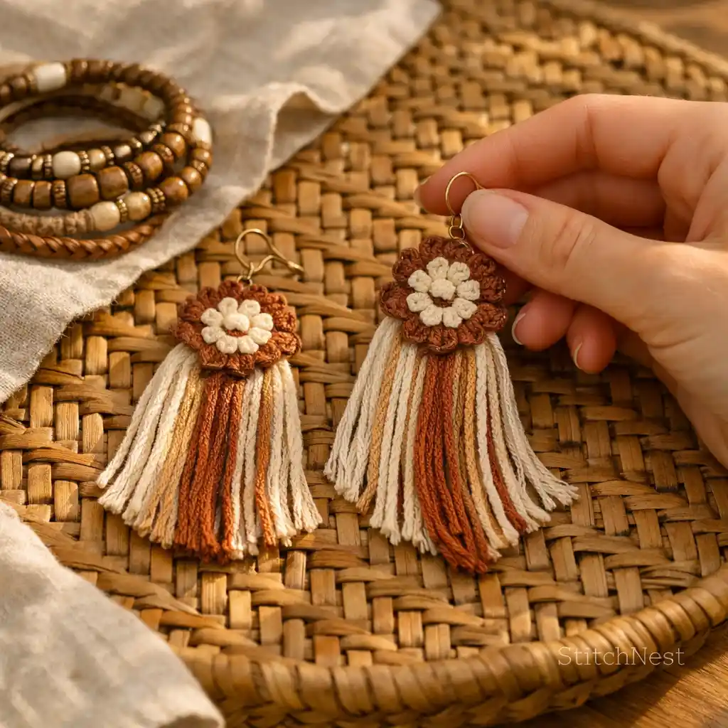 These bring a relaxed, free-spirited feel with a mix of floral detail and soft fringe. The added movement makes them feel playful without being too bold. You might enjoy making these when you want something a little different from classic crochet earrings.