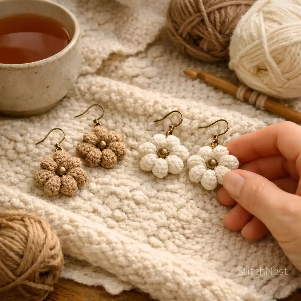 If you enjoy a bit of dimension, puff stitches create a fuller, slightly raised look. These crochet flower earrings feel soft and textured, making them stand out without needing bold colors. They are satisfying to make once you get into the rhythm.